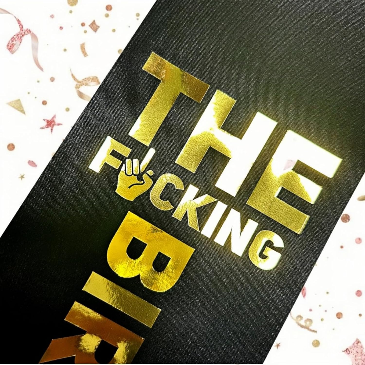 Our sash features a black fabric base with a glittery gold font that says “The f*cking birthday queen”. It also has a white matte font that adds some contrast and elegance. The sash has two awesome icons: a crown that represents your queen status, and a middle finger that replaces the “U” in “f*cking”, expressing your attitude and sass. The sash is made of high-quality fabric that is soft and comfortable to wear. It measures 33.5 x 3.74 inches (approximately 85 x 9.5 centimeters), which fits most body types.